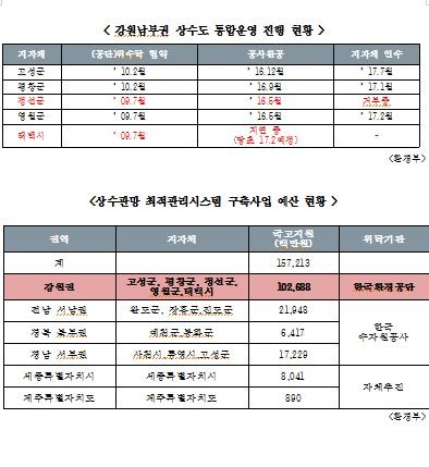 24일 국민의당 김삼화 의원(국회환경노동위원회)이 한국환경공단, 고성군, 태백시, 정선군으로부터 제출받은 강원남부권 상수도 통합운영 진행상황에 대한 자료 분석과 현장점검 결과, 태백시는 준공 지연, 정선군은 시설 인수인계 거부, 고성군은 주민 소송을 이유로 위수탁 협약을 미루고 있는 것으로 나타났다.
