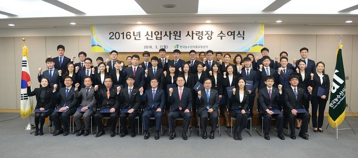 [환경데일리 윤경환 기자] 한국농수산식품유통공사(aT, 사장 김재수)는 7일 신입직원에게 사령장을 수여함으로써 2016년도 상반기 정규직 신입직원 채용을 마무리했다.,