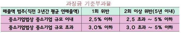 개정된 시행령에서는 1회 적발 시 매출액 대비 3%(중소기업은 2.5%) 이하, 2회부터 매출액 대비 5% 이하의 과징금을 부과할 수 있도록 했다.