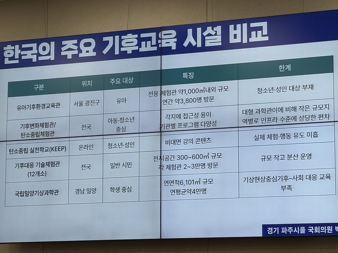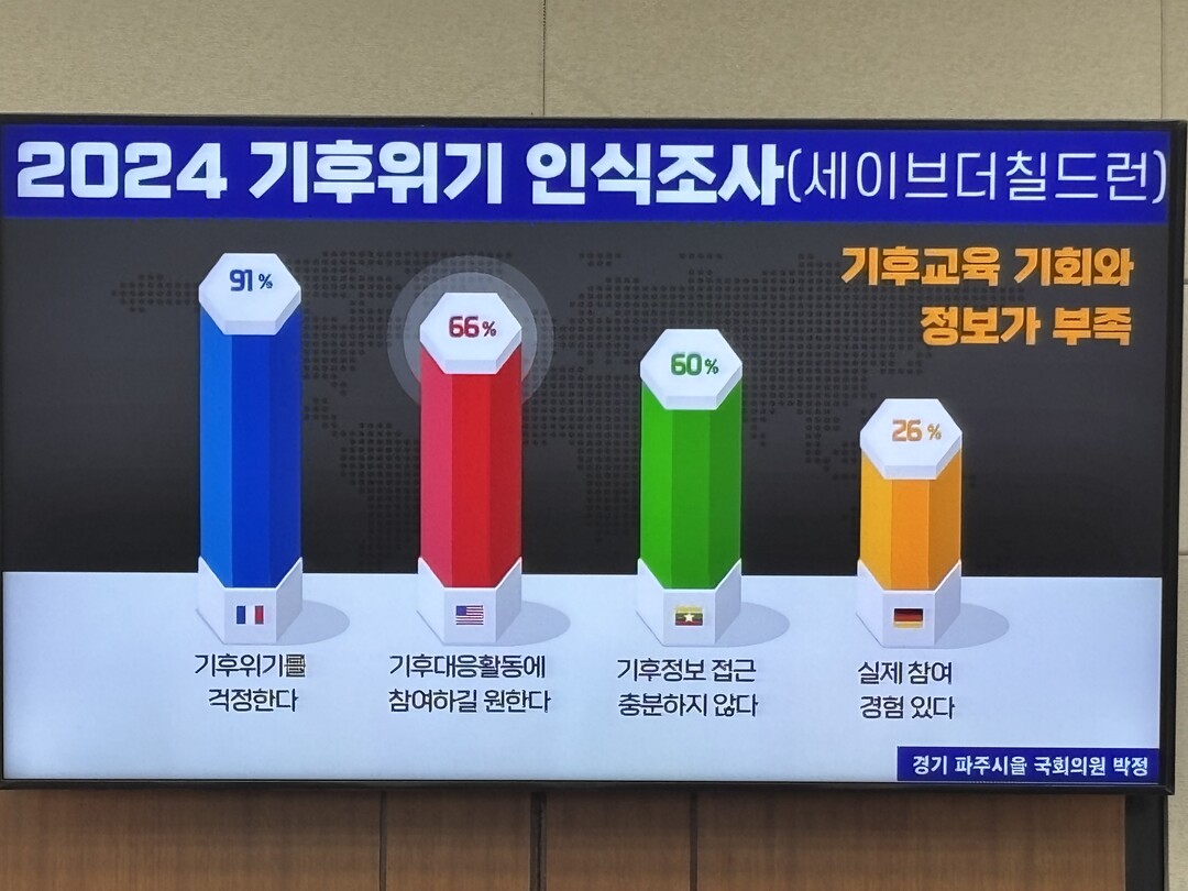 박정 더불어민주당 의원은 기후위기에 따른 학생은 물론 국민들을 체험할 수 있는 국가차원에 기후대응학교 등 건립을 추진해야 한다고 말했다.