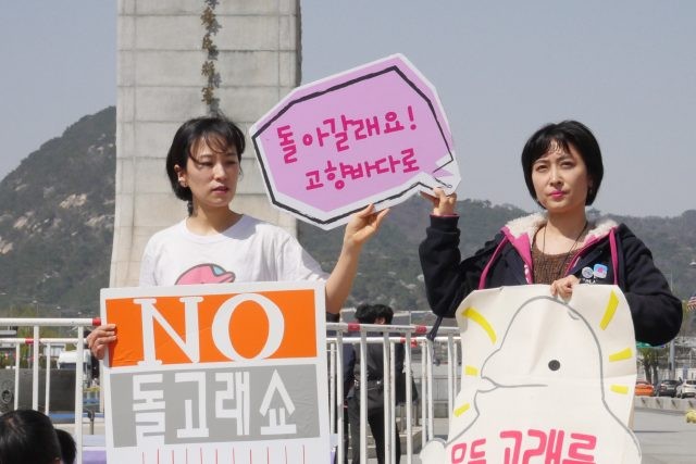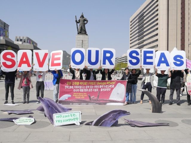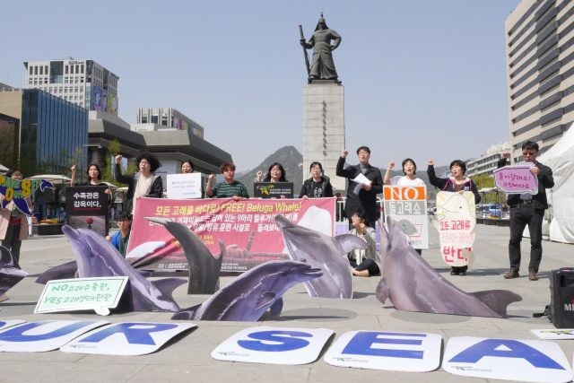15일 오후 환경운동연합바다위원회를 비롯한 동물권행동 카라, 동물해방물결, 시민환경연구소, 핫핑크돌핀스, 환경보건시민센터 등은 광화문에서 기자회견을 열고 '국내 사육중인 벨루가를 러시아 바다로 방류하라'고 촉구하며 고래모형전시와 퍼포먼스를 벌였다.