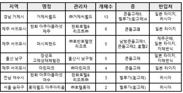 현재 국내 수족관 7곳에 러시아 북극해에서 잡혀온 벨루가 총 38마리의 고래류가 갇혀 있다.