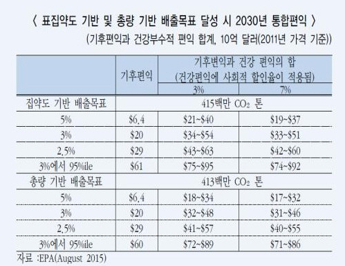 온실가스 감축비용과 편익을 고려한 온실가스 감축의 순편익은 2030년에 집약도 기반 배출목표의 경우에는 260억 달러~450억 달러, 총량 기반 배출목표의 경우에는 260억 달러~430억 달러(할인율 3% 기준)에 이를 것으로 추정된다.