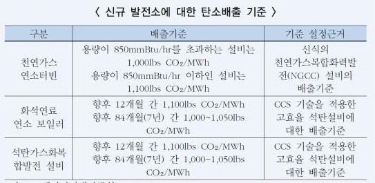 이번 기존 화력발전소의 배출규제는 증기터빈발전방식과 연소터빈발전방식의 두 종류로 구분, 집약도 기반 배출목표와 총량 기반 배출목표를 설정하도록 돼 있다. 배출목표 달성에는 저탄소 연료로의 연료전환, 신재생에너지 발전 확대, 효율 제고 이외에 수요측 효율제고, 다른 주의 온실가스 감축 크레딧 활용 등도 사용될 수 있다.