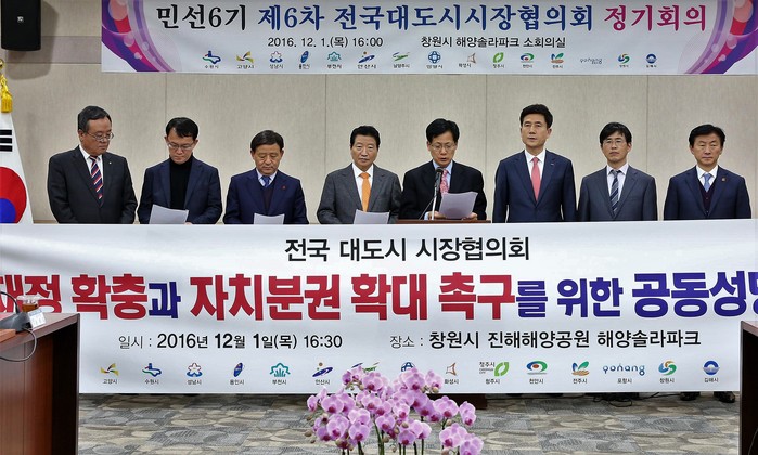 아울러 "박근혜 게이트에서 나타난 국정농단사태의 문제점은 제왕적 대통령제의 구조적 문제점으로 지방분권이 해답"이라며 "전국 대도시 시장님들과 협력하고 소통해 지방자치의 향상과 대도시간 상생 발전을 이루는 미래를 함께 만들어 나갈 것"임을 강조했다.