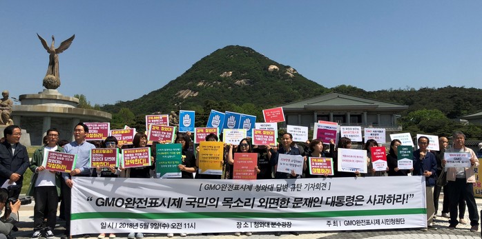 GMO 완전표시제를 촉구하는 국민청원에 8일 오전 청와대가 유보적인 답변을 한 것이 대해 'GMO완전표시제 시민청원단'은 기자회견을 개최, 국민의 목소리를 외면한 문재인 대통령의 사과를 요구하라는 입장을 밝혔다.