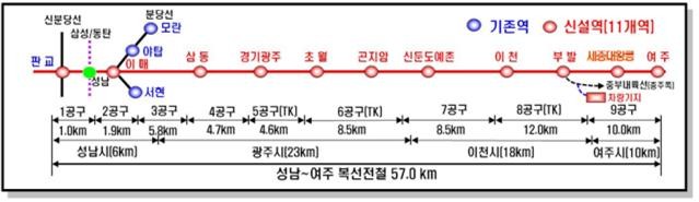 성남시 2개, 광주시 4개, 이천시 3개, 여주시 2개 등 총 11개 역에 정차하며, 현재 시외버스로 1시간 반 이상 소요되던 판교~여주간 이동시간이 이번 개통으로 약 48분으로 대폭 단축된다.