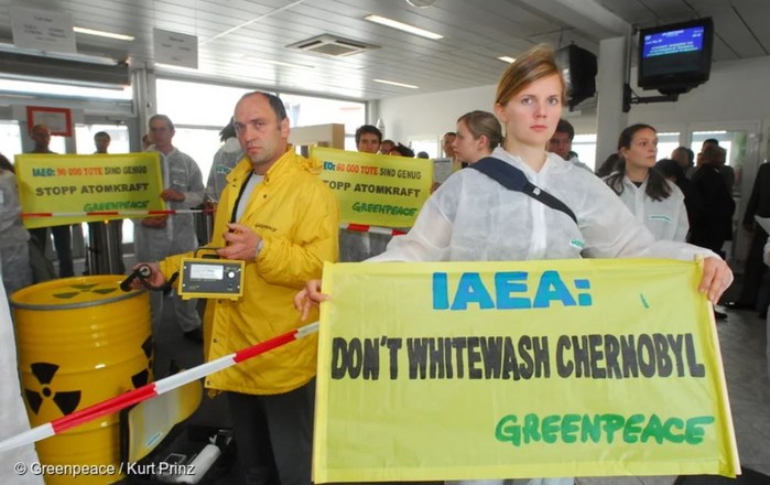▲2006년 그린피스 캠페이너가 IAEA 건물에서 1986년 체르노빌 원전 사고의 결과를 경시하는 IAEA의 비전문적 태도를 경고하는 모습 |