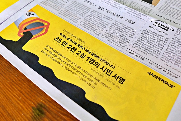 ▲7월 5일, 그린피스는 후쿠시마 오염수 방류를 반대하는 한국 시민 35만 2천 2십 1명의 서명을 신문광고로 한국 정부에 전달 |