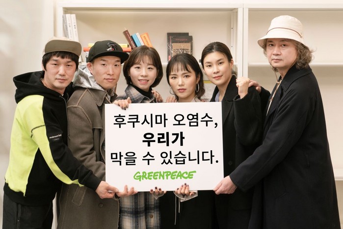▲오염수 해양 방류 반대 의지와 응원을 담아 직접 메시지 카드를 들고 사진 촬영에 임해준 밴드 이날치. 1집 수궁가의 '의사줌치'를 편곡, 개사해 뮤직비디오 <후쿠시마 오염수 (feat. 그린피스)>에 담았습니다. |