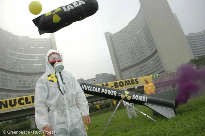 ▲2005년, 그린피스가 IAEA 연차 총회 개막일에 원전을 홍보하고 핵무기 확산을 방조하는 IAEA를 규탄하는 모습 |
