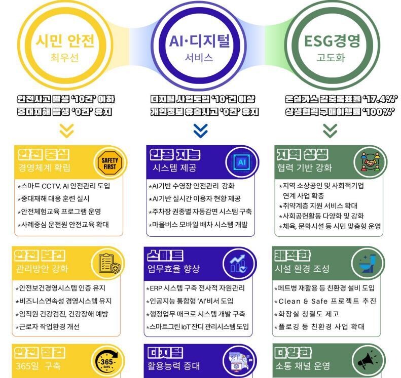 주요 과제로 AI 기반 수영장 안전 관리 시스템 고도화, 실시간 수영장 혼잡도 정보제공, 주차장 권종별 자동 감면 시스템 구축 등이 추진된다. 마을버스는 빅데이터 분석 시스템과 유비쿼터스 기반 모바일 배차 시스템을 도입해 운행의 효율성을 높이고 시민들의 대기 시간을 단축한다.