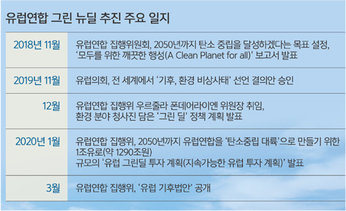 올 초에 2050년 탄소 중립 실현을 위한 1조 유로(약 1290조 원) 규모의 '유럽 그린 딜 투자계획'을 공개했다. 일찍부터 그린뉴딜 추진한 EU 회원국들은 친환경 에너지 전환 관련 부분에서 선전하고 있다.