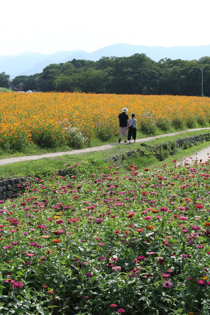 탁 트인 푸른 잔디 광장을 배경으로 오롯이 천년을 이어온 고대 신라의 흔적인 첨성대와 왕릉 주변으로 화사한 황화코스모스와 백일홍이 눈길 닿는 곳마다 가득 피어 아름다운 자태를 뽐내고 있다.