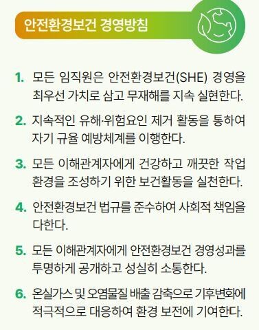 SHE(안전·보건·환경, Safety·Health·Environment) 경영방침을 바탕으로 위험성평가 시스템 고도화와 안전환경보건위 운영 등 체계적인 안전관리 활동을 지속하겠다는 의지를 밝혔다.