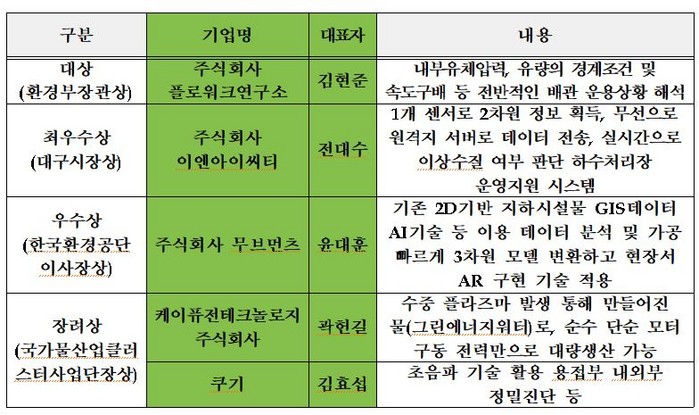 창업공모전은 물산업 분야 예비창업자 및 7년 이내 창업기업을 대상으로 지난 11월 공모를 실시, 총 41개팀이 접수됐으며, 전문가 심사(1차 서류 및 2차 발표)등을 거쳐 최종 5개팀을 선정, 대상(환경부장관상), 최우수상(대구시장상), 우수상(한국환공단이사장상)등과 총 상금 1400만원을 지급했다.