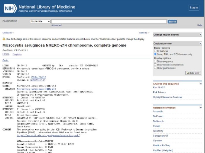 환경부 소속 국립환경과학원(원장 금한승)은 낙동강에서 녹조를 유발하는 유해남조류의 '전장유전체' 유전정보를 국내 최초로 분석(whole genome sequencing)에 성공해 관련 유전정보를 미국 국립생물공학정보센터(NCBI)에 최근 등록했다고 밝혔다.