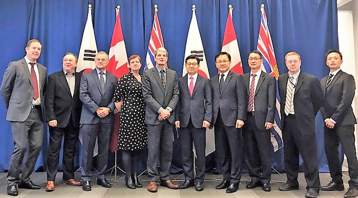 | ▲23일(현지시간) 캐나다 밴쿠버 주교통부(Translink) 본청에서 열린 계약식에서 케빈 데스몬드 캐나다 밴쿠버 주교통부 사장(왼쪽 다섯 번째부터)과 김승탁 현대로템 사장이 기념촬영을 하고 있다. |