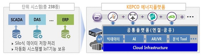 기존에 운영 중인 238종에 달하는 각종 개별 시스템들을 공용플랫폼에 단계적으로 연결시켜, 방대한 전력설비 운영 데이터, 전력사용량, 신재생 에너지 등을 통합 수집, 적재, 저장, 분석, 예측 등 빅데이터와 기계학습 처리를 가능하게 했다.