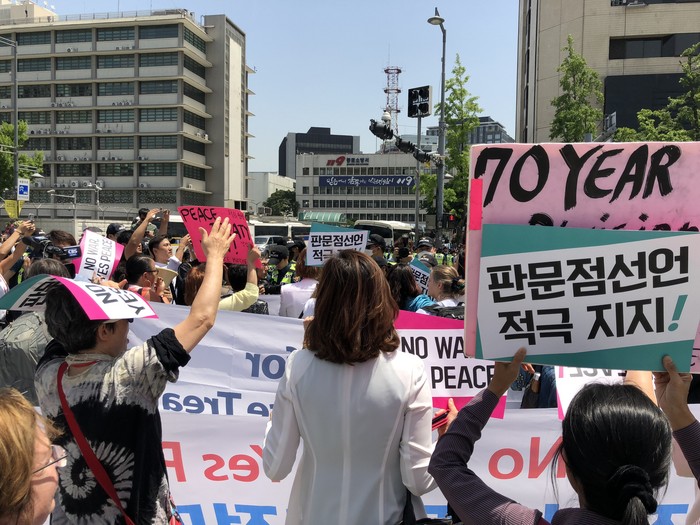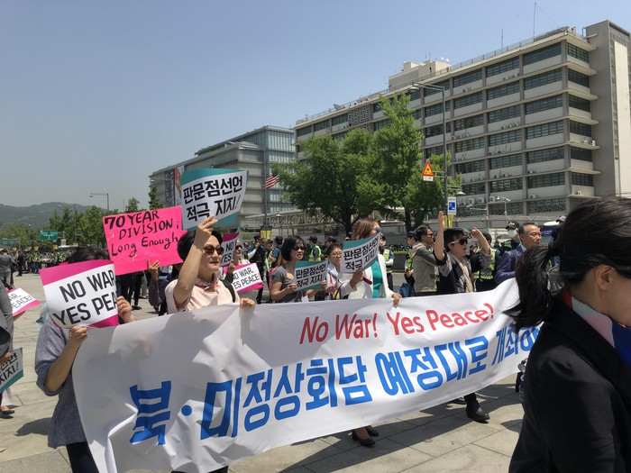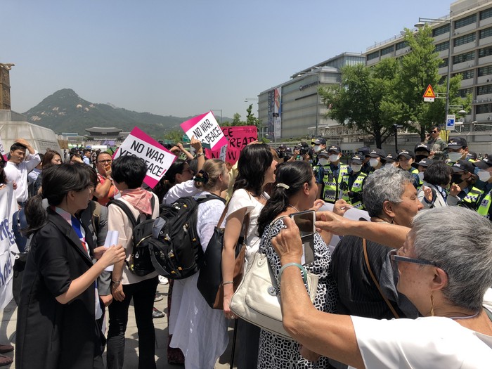 이들은 전쟁없는 평화, 북미정상회담 촉구의 피켓을 들고 구호를 외쳤다. 이들은 미 대사관으로 행진하려 했으니 경찰의 저지선을 넘지 못했다.