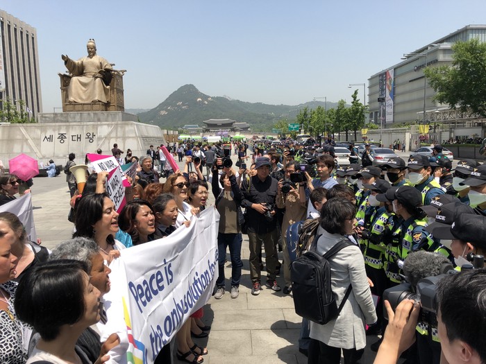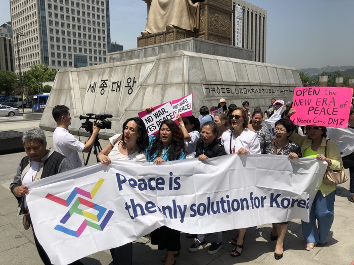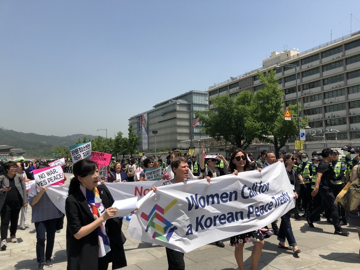 기독교 여성시민단체를 비롯해 30여개 여성·평화운동 단체로 구성된 ‘2018 여성평화걷기조직위원회’가 25일 11시부터 12시까지 서울 광화문광장 미 대사관 앞에서 북미정상회담 촉구를 위한 세계 여성평화운동가 긴급기자회견을 열었다.
