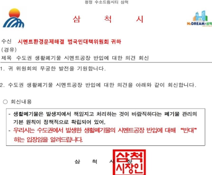 삼척·단양 수도권 쓰레기 반대 입장 내놔