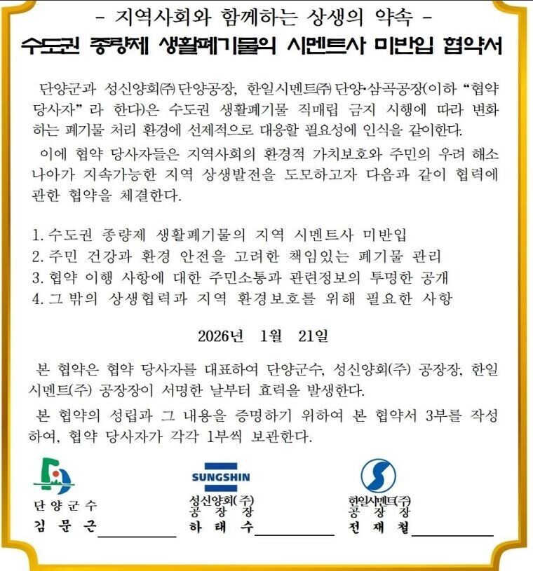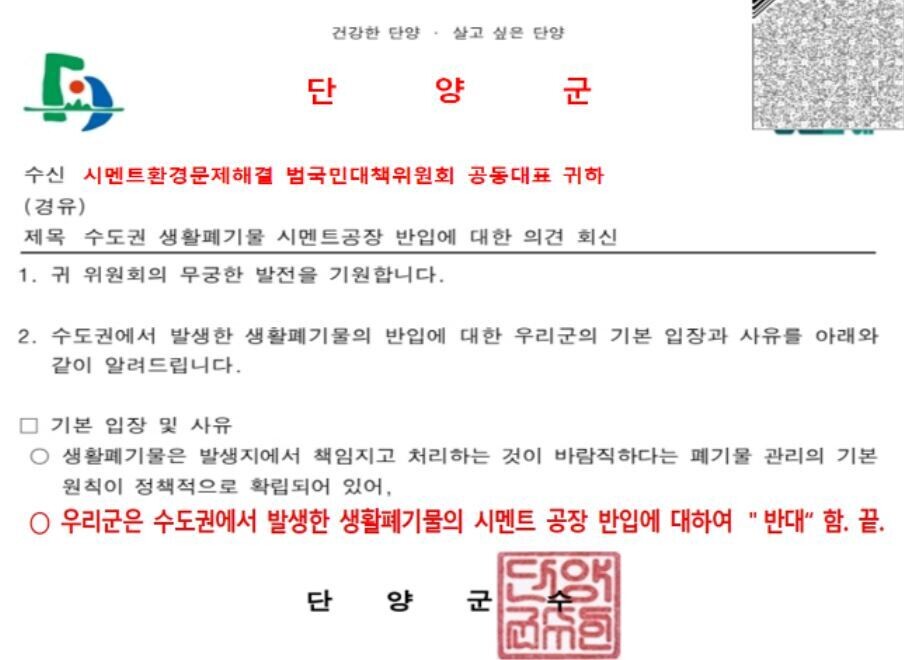 단양군은 이미 관내 2개 시멘트업체와 직매립금지 폐기물을 반입 받지 않기로 협약을 체결했다. 단양군과 삼척시는 범대위로 수도권에서 발생한 직매립금지 생활폐기물의 시멘트공장 반입을 반대한다는 공식 입장을 서면으로 보내오기도 했다.