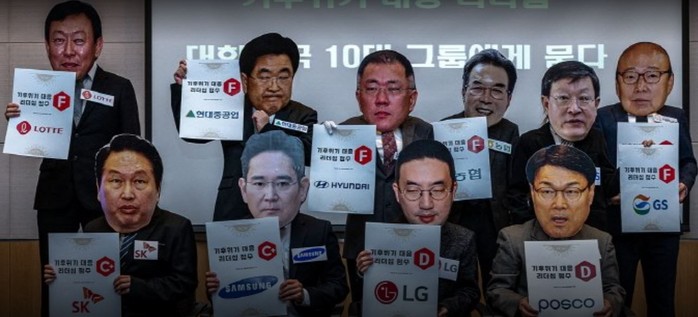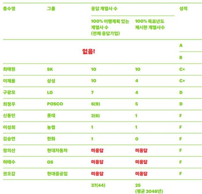 | ▲10대 대기업의 온실가스 감축 등 성적표는 초라하다. 심지어 전멸에 가깝게 F학점을 받는 기업도 많다. 사진 제공 그린피스 |