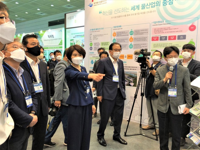 | ▲에너지 환경산업전시회인 2021 엔벡전에서 한정애 장관은 부스를 찾아 수처리, 재생재활용의 중요성을 다시한번 강화해야 한다고 언급했다. 사진은 권칠승 중소벤처기업부 장관, 임종성 국회환노위 소속 의원과 함께 한국환경공단 부스를 찾아 관계자들로부터 설명을 듣고 있다. |