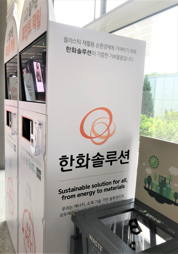 ▲한화솔루션은 코엑스 전시 공간에 투명 페트병 회수를 위한 재활용 순환 경제에 도움을 주기 위한 캠페인을 펼치고 있다. |