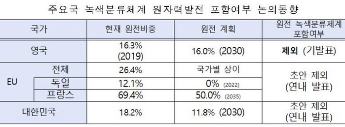 최근 발표한 영국 정부는 녹색금융 지원대상에서 원자력을 뺐다. EU 역시 녹색분류체계 초안에 원자력 포함을 놓고 고심중이다.
