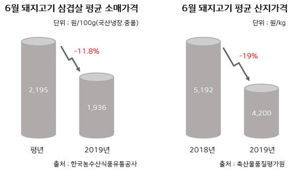 축산물품질평가원에 따르면 6월 돼지고기 평균 산지가격은 kg당 4200원으로 전년 같은 기간보다 19% 하락했다. 6월 가격으로는 2008년 이래 가장 낮은 가격이며, 사상 최대 폭락했던 2013년 가격도 올해보단 높았다. 소매가격도 마찬가지로 한국농수산식품유통공사에 따르면 6월 돼지고기 삼겹살(국산냉장.중품) 100g당 평균 가격은 1936원으로 평년 2195원을 크게 밑돌았다.