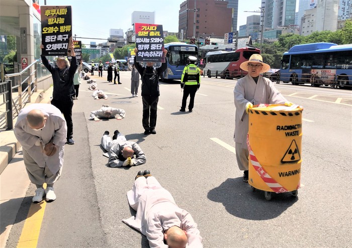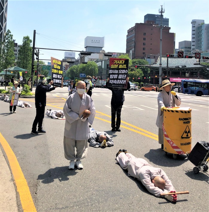 기사다 일본 총리가 방한한 가운데 조계종 스님 등 일반회원들은 피켓을 들고 우리 국민들이 건강 생명을 위협하는 방사능 오염수 방류는 안된다고 일본 정부와 우리 정부측에 뜻을 전달했다.