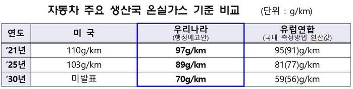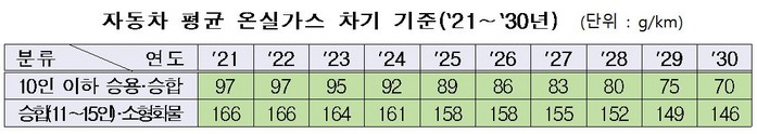 30년 평균 온실가스 배출량 70g/km 기준 대폭 강화