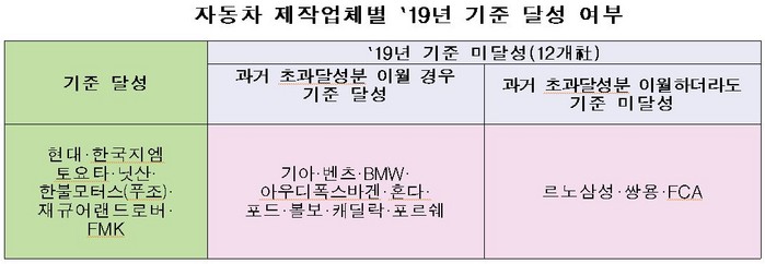 2019년 기준을 미달성한 12개 업체 중 기아, 벤츠, BMW, 아우디폭스바겐, 혼다, 포드, 볼보, 캐딜락, 포르쉐 등 9개 업체는 과거 초과달성분을 이월하는 경우 기준을 충족한다. 다만, 르노삼성·쌍용·에프씨에이 등 3개 업체는 과거 초과달성분을 이월하더라도 기준을 달성하지 못하고 있다.