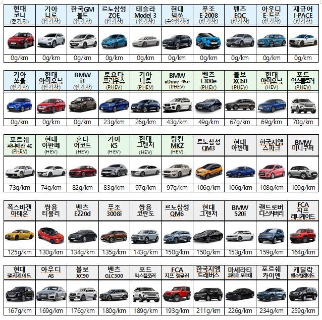 반대로 가장 많이 온실가스를 배출하는 차종은 캐딜락 에스컬레이드 259g, 포르쉐 카이엔 234g, 마세라티 콰트로 포르테 226g, 한국지엠 트래버스 211g, 지프랭글러 193g, 포드 익스플로러 189g, 벤츠 glc300,볼보xc90 176g, 아우디 a5 169g, 현대 펠리세이드 167g, 지프 레니게이드 164g, 랜드로버 디스커버리 159g, bmw 520i 153g, 현대그랜저 150g, 르노삼성qm6 150g, 쌍용코란도 143g, 푸조 3008i 135g 순이다.