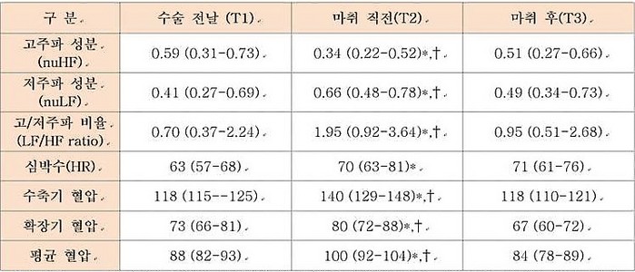 환자의 불안감과 긴장감이 고조되면서 저주파 성분과 관련 깊은 교감신경은 활성화된 반면, 부교감신경이 억제되며 고주파 성분의 수치가 저하된 것이다. 이러한 변화는 마취 이후 진정세를 보이며 마취 전날과 엇비슷한 수준으로 회복됐다.
