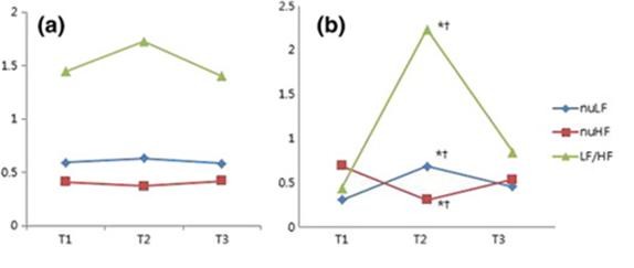 | ▲우울감이 높았던 환자 그룹(a)은 낮은 환자 그룹(b)과 달리 모든 측정 시점에서 심박변이도의 유의미한 변화가 관찰되지 않았다. 그만큼 우울 감이 높은 환자의 경우 스트레스에 대한 심장의 대응 능력이 저하돼 있 다고 볼 수 있다. |