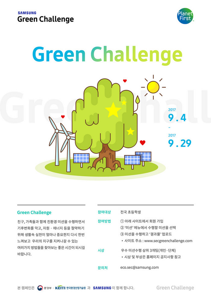 [환경데일리 최인배 기자]삼성전자는 4일부터 29일까지 전국 6000여개 초등학교 학생들을 대상으로 일상 생활 속에서 친환경 미션을 수행하는 '그린 챌린지(Green Challenge)' 캠페인을 실시한다.