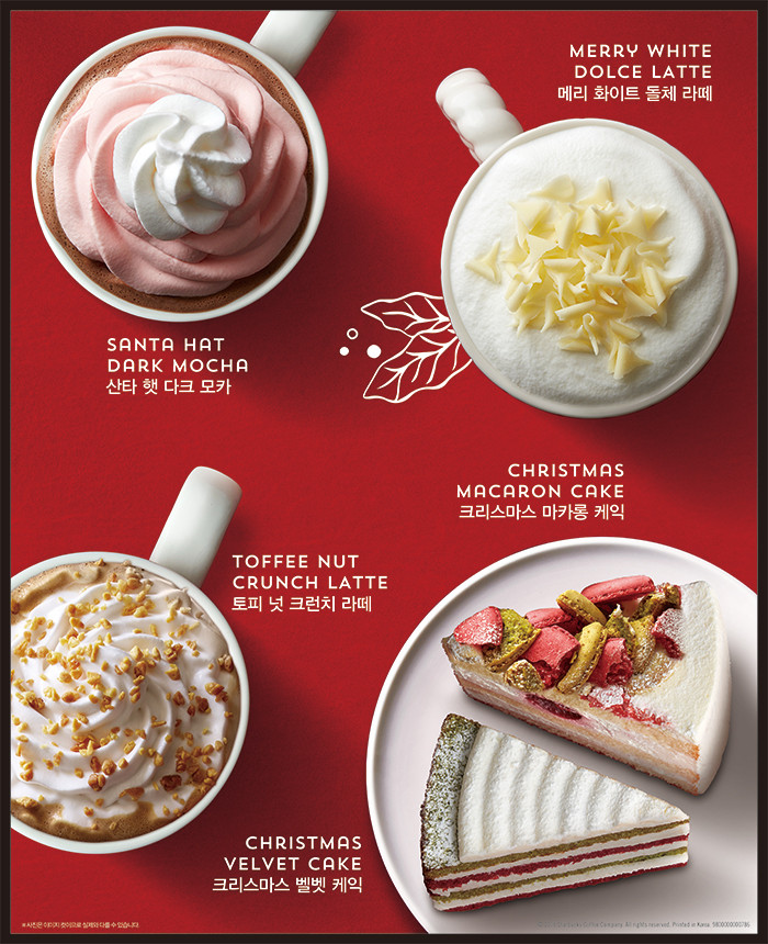 우선 스타벅스의 전통적인 크리스마스 음료 토피 넛 라떼가 '토피 넛 크런치 라떼'로 업그레이드 돼 찾아온다. 여기에 스타벅스커피 코리아가 자체 개발한 메리 화이트 돌체 라떼와 산타 모자 형태의 휘핑 크림이 인상적인 산타 햇 다크 모카도 출시된다. 작은 요정들이 뛰어 놀 것만 같은 레드 앤 그린 색상의 크리스마스 벨벳 케익과 크리스마스 시즌에만 한정 판매되는 크리스마스 마카롱도 함께 출시될 예정이다.