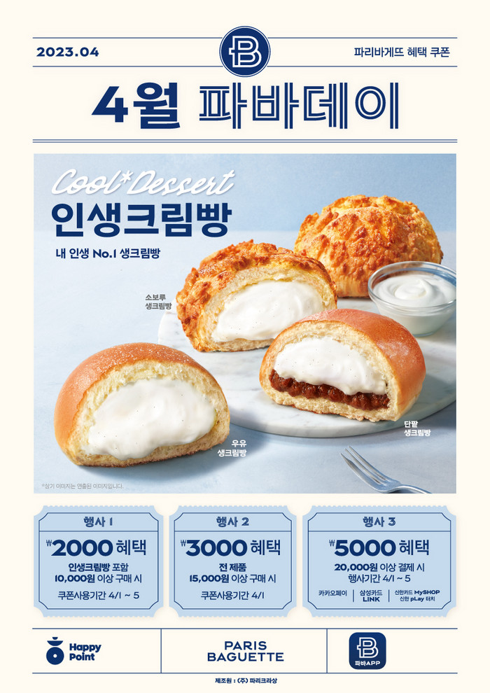 특별히 파리바게뜨는 달달한 간식이 생각나는 봄 시즌을 맞아 부드러운 우유 생크림을 풍성하게 가득 채운 '인생크림빵'을 이 달의 프로모션 제품으로 선정하고 연계 프로모션을 진행한다. 4월 1일부터 5일까지 인생크림빵 포함 1만원 이상 구매 시 2000원 상당의 혜택을, 2만원 이상 구매시에는 5000원 상당의 혜택을 제공한다.