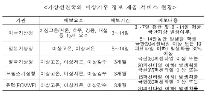 또한 미국, 일본, 프랑스 등 기상선진국의 경우 발표하고 있는 이상기후 발생가능성에 대한 예측정보 또한 지금까지 국민들이 쉽게 접할 수 없었다.
