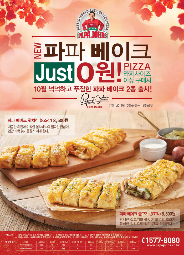 11월 5일까지 진행되는 이번 프로모션은 파파존스에서 라지사이즈 이상 피자 주문 시, 정가 8500원의 파파 베이크 2종을 단돈 0원에 맛볼 수 있는 특별한 기회이다.