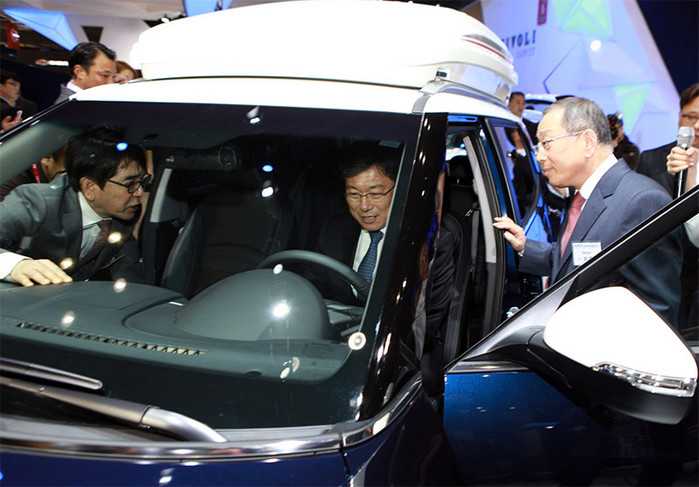 | ▲ 윤상직 산업통상자원부 장관이 티볼리에 탑승해 차량 내부를 살펴보고 있다. (사진 : 쌍용자동차) © 환경데일리 |