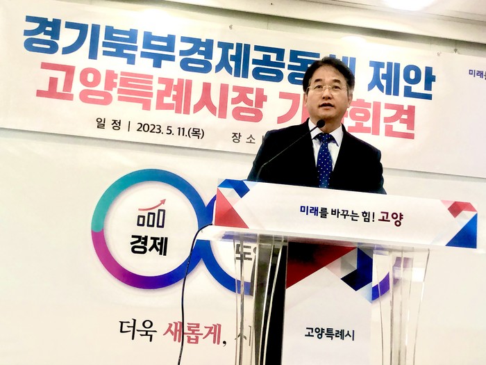 11일 고양시청에서 열린 기자회견에서 경기북부경제공동체 공식 제안하고 경기북부 지역 10개 시·군에 공동체 구성에 동참할 것을 밝혔다.