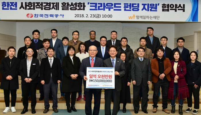 [환경데일리 최인배 기자]한국전력(사장직무대행 김시호)은 23일 한전아트센터에서 함께일하는재단과 20개 사회적경제조직 대표 등이 참석한 가운데 사회적경제조직 크라우드 펀딩 지원 협약식을 열고, 함께일하는재단에 후원금 1억 5000만원을 전달했다.