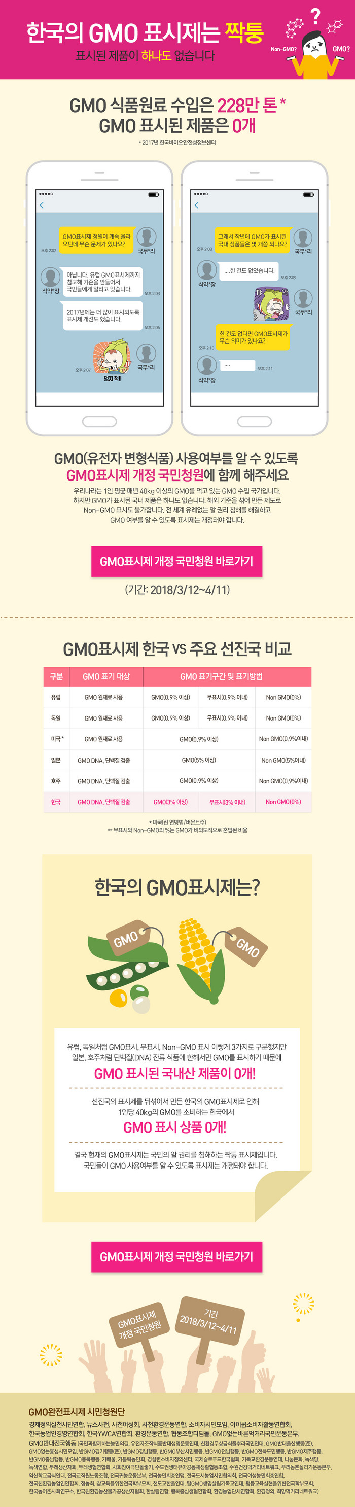 포털사이트 지역 커뮤니티에도 'GMO 완전표시제가 시행돼야 한다'는 게시글이 수십 건에 달하고 있다. 공원, 거리, 학교 앞에서도 GMO 표시제 개선을 요구하는 국민들의 목소리가 커지고 있다.