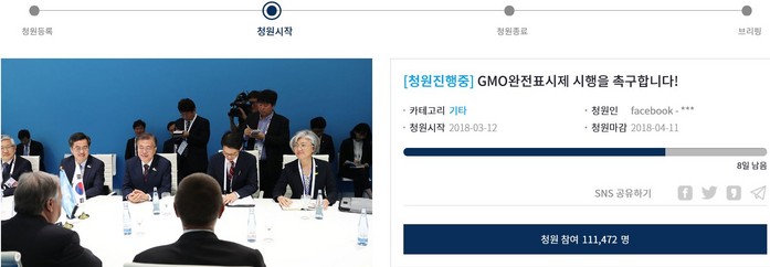 이에 따라 소비자 알 권리, 선택할 권리 보장과 생산자 보호를 위해 현행 GMO 표시 개정을 청원이 8일 남았다.