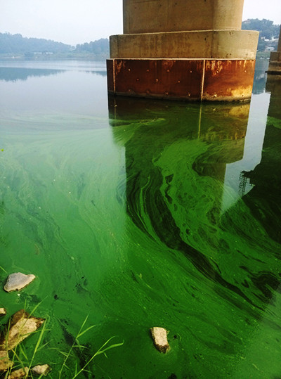 ▲낙동강 밀양교 아래에 발생한 녹조현상, 사진제공 마창진환경운 동연합 |