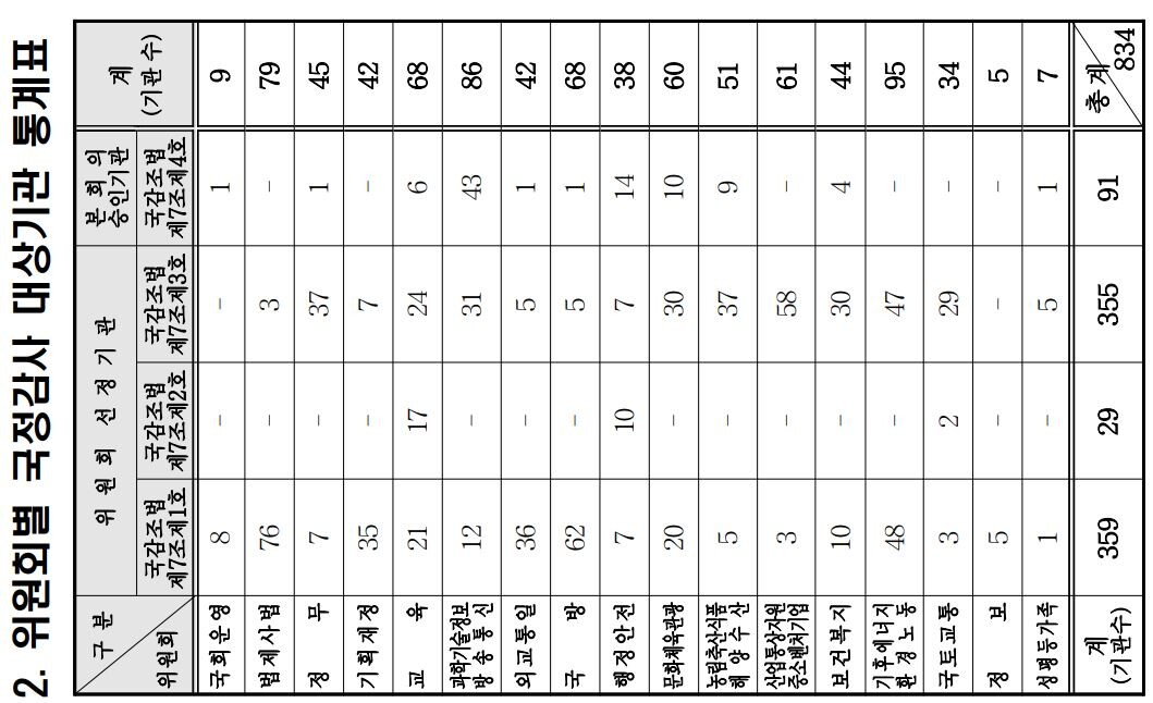 위원회별 국감 대상기관별로 살펴보면, 피감 기관이 가장 적은 상임위는 성평등가족위원회 7개 기관, 다음으로 국회운영위원회는 9개 기관이다.